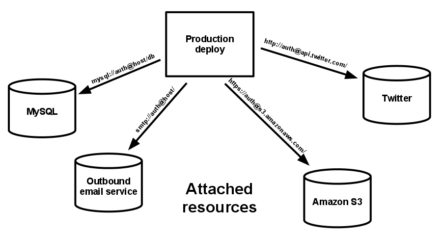 데이터베이스와 같은 백엔드 서비스들은 통상적으로 배포된 애플리케이션과 같은 시스템 관리자에 의해서 관리되고 있었습니다. 애플리케이션은 이런 로컬에서 관리하는 서비스 대신, 서드파티에 의해서 제공되고 관리되는 서비스를 이용할 수 있습니다. 예를 들어, SMTP 서비스 (예: Postmark), 지표 수집 서비스 (예: New Relic, Loggly), 스토리지 서비스 (예: Amazon S3), API로 접근 가능한 소비자 서비스 (예: Twitter, Google Maps, Last.fm)등이 있습니다.