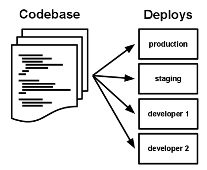 앱의 코드베이스는 한개여야 하지만, 앱 배포는 여러개가 될 수 있다. 배포는 실행중인 앱의 인스턴스를 가리킨다. 보통 운영 사이트와 여러 스테이징 사이트가 여기에 해당된다. 모든 개발자는 자신의 로컬 개발 환경에 실행되는 앱을 가지고 있는데, 이것 역시 하나의 배포로 볼 수 있다.(옆 그림참조)