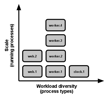 프로세스 모델이 진정으로 빛나는 것은 수평적으로 확장하는 경우입니다. 아무것도 공유하지 않고, 수평으로 분할할 수 있는 Twelve-Factor App 프로세스의 성질은 동시성을 높이는 것은 간단하고 안정적인 작업이라는 것을 의미 합니다. 프로세스의 타입과 각 타입별 프로세스의 갯수의 배치를 프로세스 포메이션이라고 합니다.
