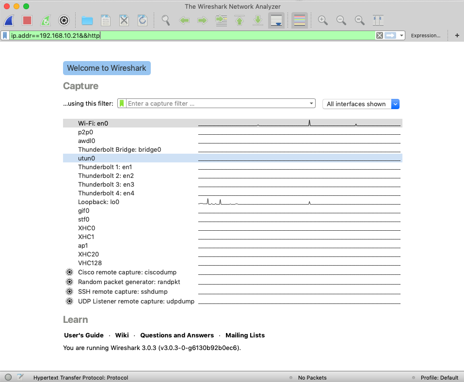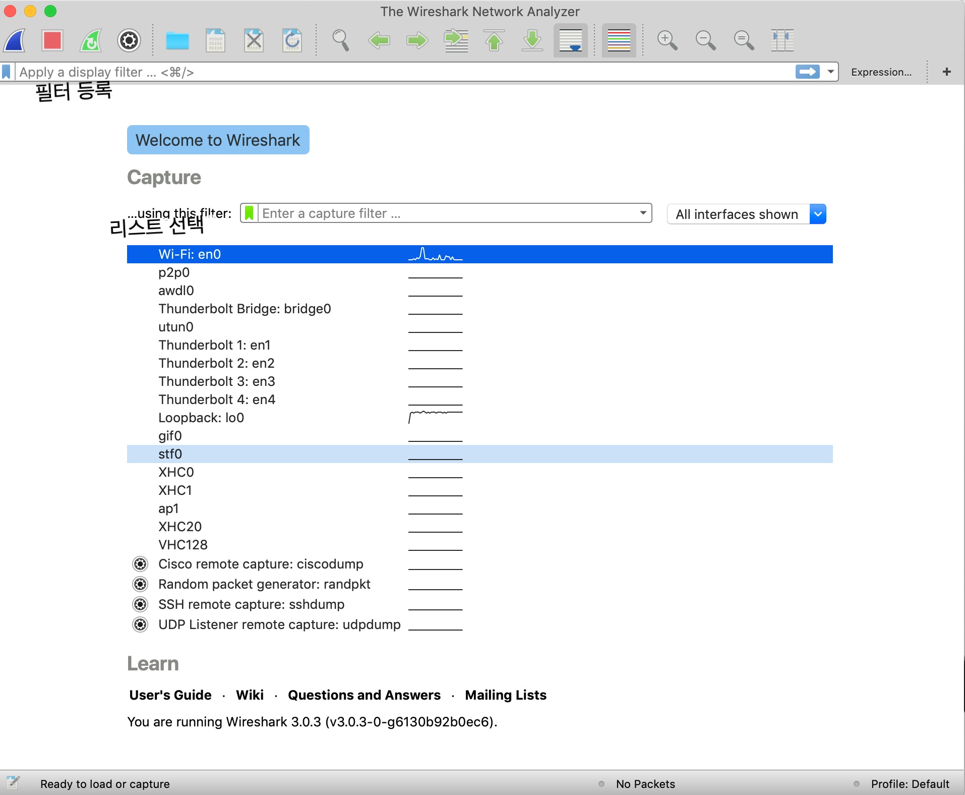 실행화면입니다. 분석하길 원하는 것을 Capture 목록에서 선택하셔도 되고 위에 보이는 필터링을 통하여 분석하길 원하는 필터값을 채워줘도 됩니다. 저는 스프링부트 테스트 프로젝트를 실행하여 로컬로 들어오는 패킷을 분석하기 위하여 로컬IP와 프로토콜을 필터로 등록하였습니다.