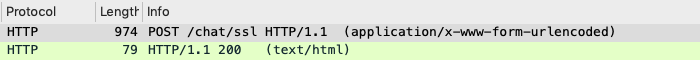 요청을 하나 보낸 후 패킷을 살펴보았습니다. "POST /chat/ssl"이라는 요청으로 데이터를 보낸 예제입니다.