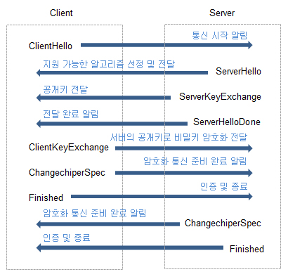 암호 알고리즘 결정, 키 분배, 서버 및 클라이언트 인증을 수행하기 위해 사용되는 프로토콜이다. 아래 그림은 간단한 해당 프로토콜의 동작방식이다.