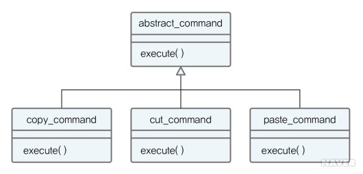 command의 의미는 '명령어'이다. 문서편집기의 복사(copy), 붙여넣기(paste), 잘라내기(cut) 등도 모두 명령어이다. 그런데 이런 명령어를 각각 구현하는 것보다는 [그림 5-52]처럼 하나의 추상 클래스에 execute() 메서드를 하나 만들고 각 명령이 들어오면 그에 맞는 서브 클래스(copy_command)가 선택되어 실행하는 것이 효율적이다. 이는 함수 오버로딩(overloading)과 같은 추상화 개념을 사용한 것이다.
