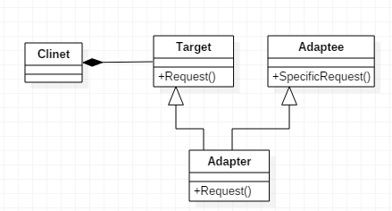 그림에서 client는 target 인터페이스를 사용하여 메서드를 호출한다. adapter에서는 adaptee 인터페이스를 사용하여 concreteMethod 호출로 변경한다. 이때 client는 중간에 adapter가 존재한다는 것을 인식하지 못한다.
