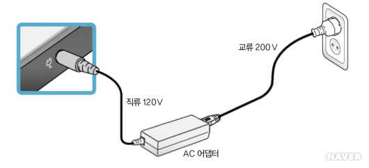 adapter의 의미는 '접속 소켓', '확장 카드', '(물건을 다른 것에) 맞추어 붙이다', '맞추다'이다. 그림처럼 전원에서 나오는 전기는 대개 교류 200V이지만 노트북은 직류 120V이다. 그러나 우리는 노트북을 사용할 때 아무런 불편 없이 노트북 선을 전원에 그대로 꽃아 사용한다. 이는 중간에 교류 200V를 직류 120V로 바꾸어 주는 무엇인가가 존재하기 때문이다. 이것이 노트북 선 중간에 붙어 있는 어댑터이다.