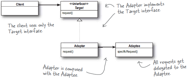 객체 어댑터 패턴은 위와 같이 구성을 이용하여 어댑터 클래스를 구성한다. 클라이언트는 어댑터 인터페이스로만 의존하고 실제적인 어댑티는 알지 못한다.