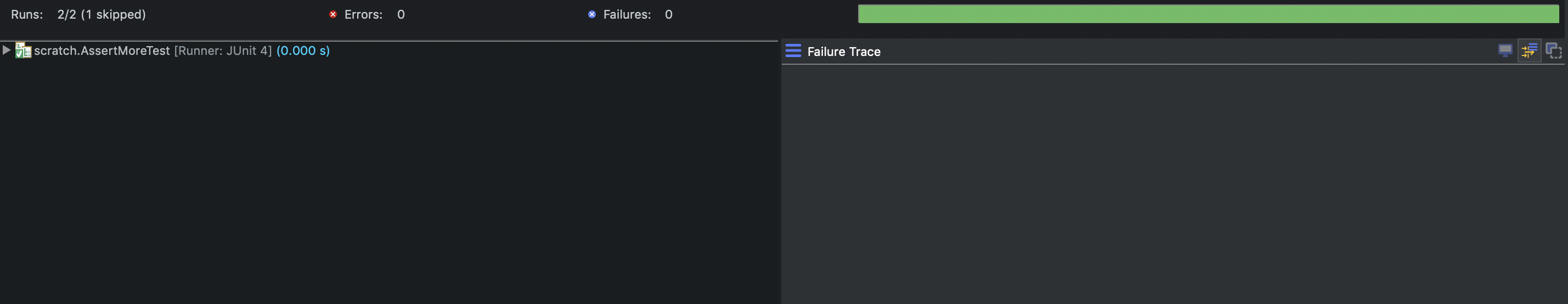 만약 테스트에서 제외하고 싶은 메서드가 있다면 @Ignore 애너테이션을 붙여준다. 그리고 결과를 보면 스킵된 테스트 개수를 볼 수 있다.(왼쪽 상단의 Runs: 2/2 (1 skipped) )