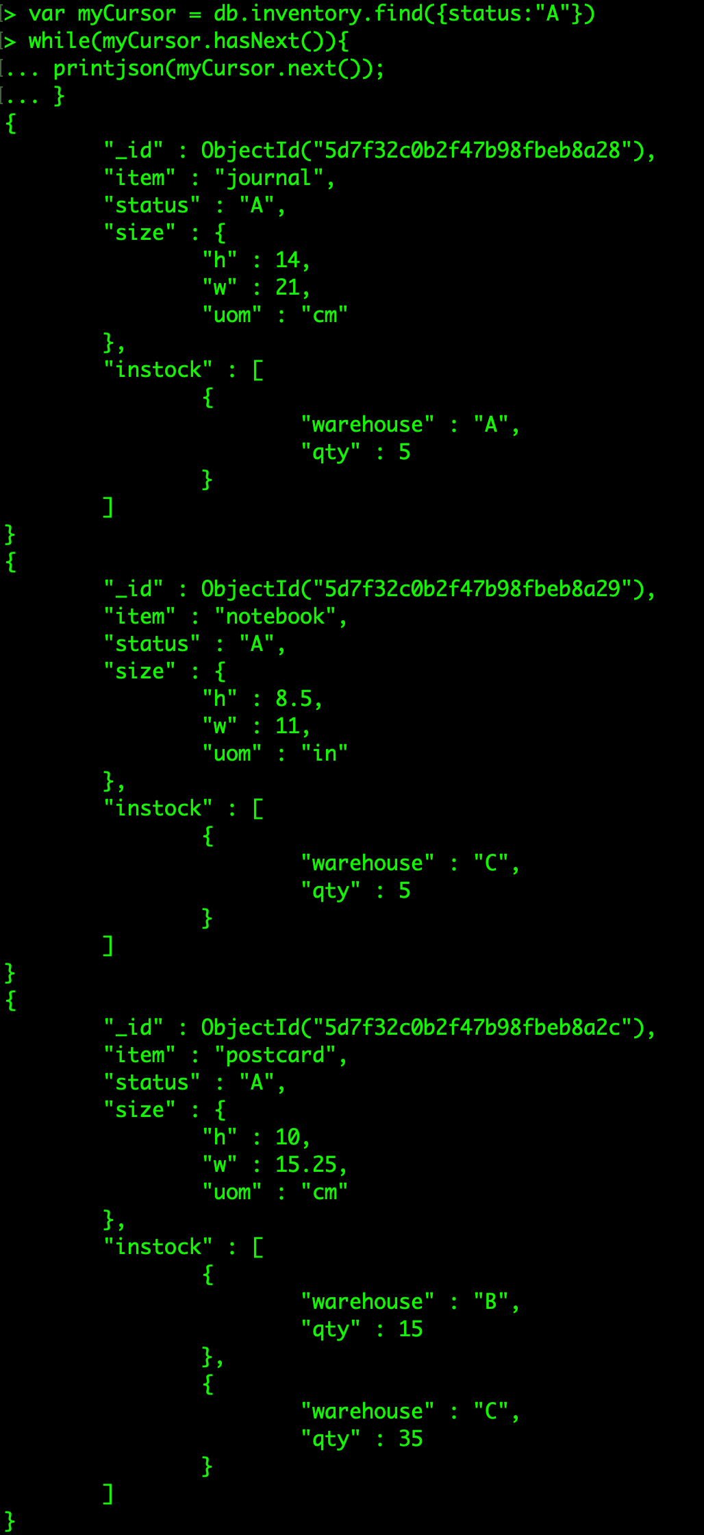{ item: "postcard", status: "A", size: { h: 10, w: 15.25, uom: "cm" }, instock: [ { warehouse: "B", qty: 15 }, { warehouse: "C", qty: 35 } ] }