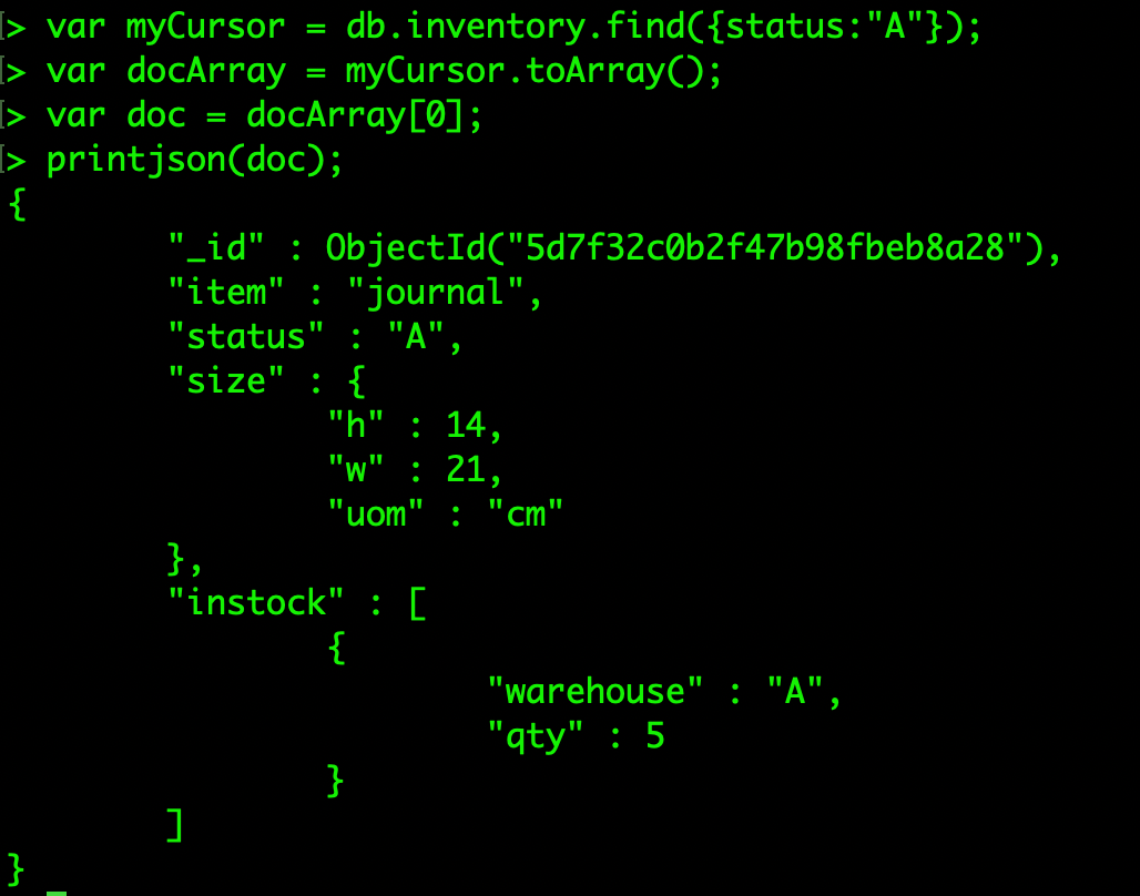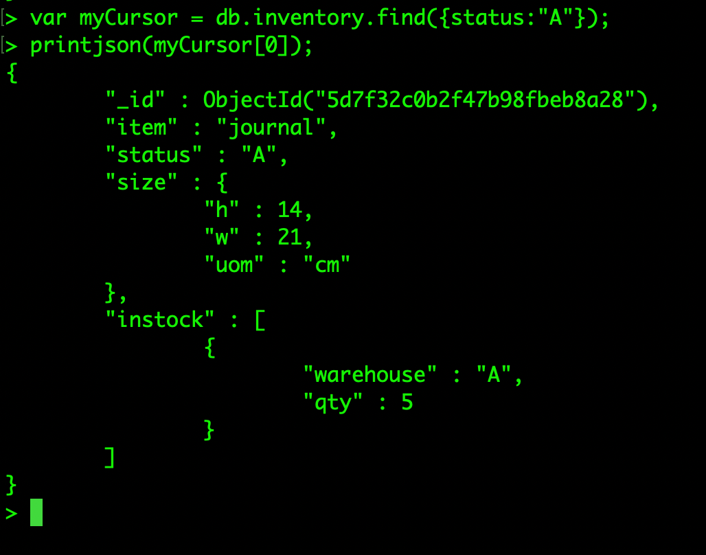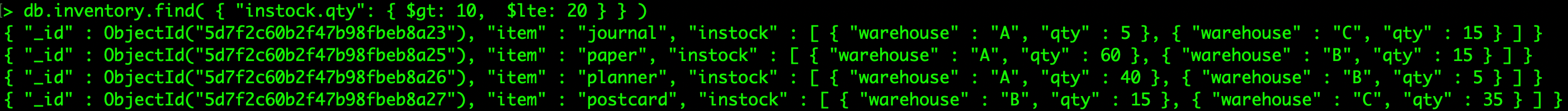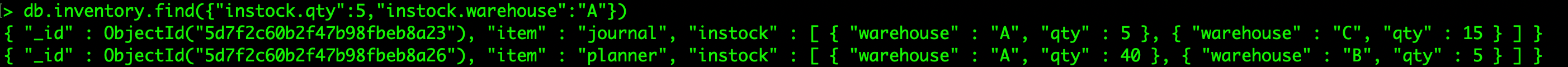 > db.inventory.find({"instock.qty":5,"instock.warehouse":"A"})