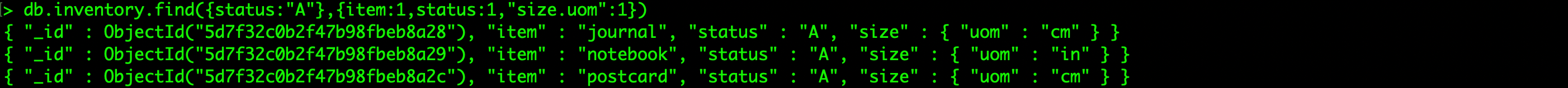 > db.inventory.find({status:"A"},{item:1,status:1,"size.uom":1})