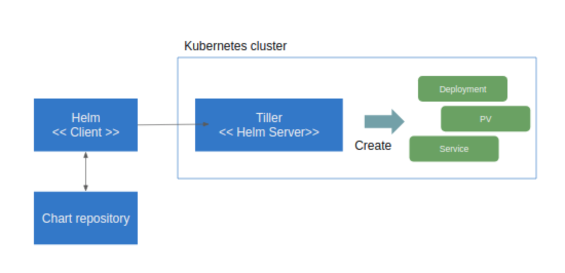 헬름은 클라이언트(cli)와 서버(쿠버네티스 클러스터에 설치되는 틸러)로 구성된다. 클라이언트는 서버를 대상으로 명령을 지시하는 역할을 한다. 서버는 클라이언트에서 전달받은 명령에 따라 쿠버네티스 클러스터에 패키지 설치, 업데이트, 삭제 등의 작업을 수행한다.
