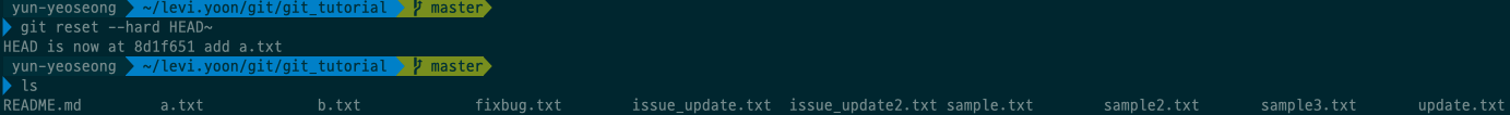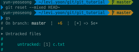 보면 c.txt 파일이 untracked된 것을 볼 수 있다. 이 말은 바로 이전 커밋으로 돌아감과 동시에 해당 파일을 staging에서 unstaging으로 만들었다. 마지막으로 git reset --hard이다.