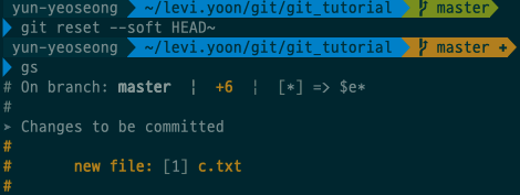 > git reset --soft HEAD~ : 최근 커밋에서 바로 이전(부모)커밋으로 HEAD를 옮긴다.