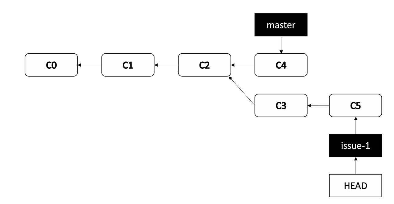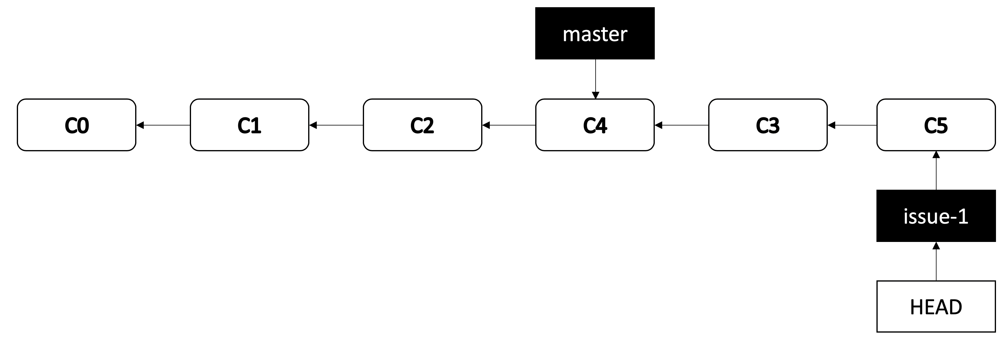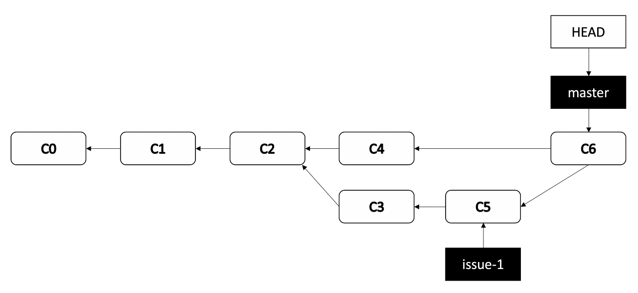 실제로 일어나는 일은 일단 두 브랜치가 나뉘기 전인 공통 커밋(C2)으로 이동하고 나서 그 커밋으로부터 지금 Checkout(issue-1)한 브랜치가 가르키는 커밋까지 diff를 차례로 만들어 어딘가에 임시로 저장해 놓고(새로운 커밋을 만든다.), Rebase할 브랜치(master) 커밋 뒤에 차례로 붙여버린다. 그리고 master에서 issue-1 브랜치를 머지하면 fast-forward merge가 된다.
