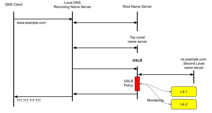 - GSLB는 DNS Proxy로 동작하며, 따라서 이 DNS Query를 그대로 example.com DNS 서버로 전달합니다.