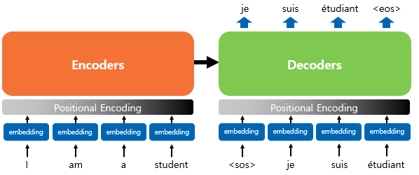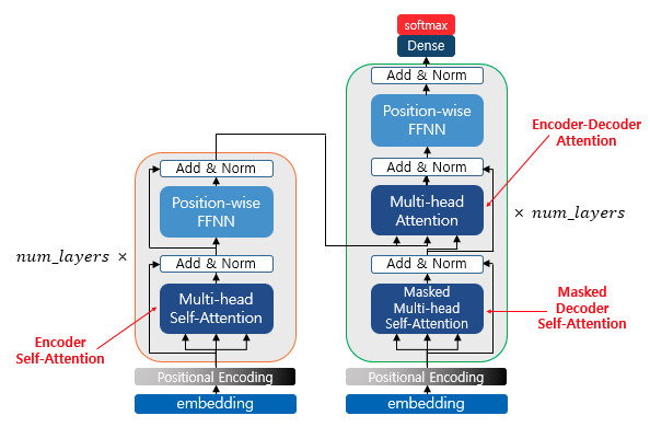 위 그림을 보면 각 인코더, 디코드 층에 입력이 들어가기전 포지셔널 인코딩 레이어가 있는 것이 특징이다.