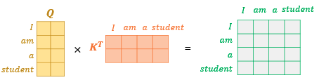 그렇게 나온 Q행렬과 K행렬로는 어떻게 어텐션 스코어를 구할까? 위 그림과 같이 K행렬을 전치한 행렬과 Q행렬을 곱하고 스케일링 값을 나눠주면(K벡터의 루트를 씌운값) 각 단어의 어텐션스코어가 포함된 행렬이 나오게 된다. 예를 들어 I행과 student열의 값은 단어 I의 Q벡터와 student K벡터의 어텐션 스코어 값이다.