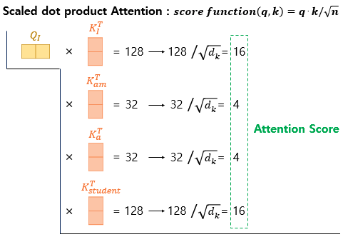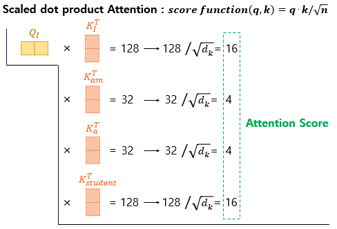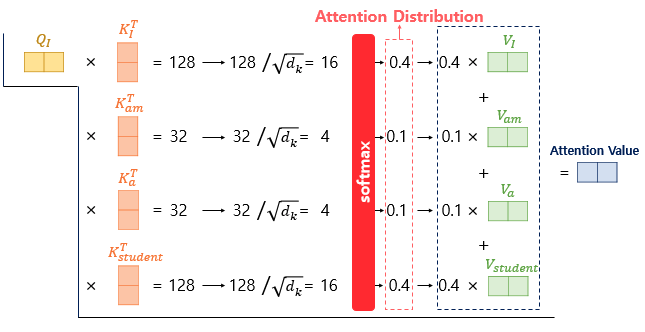 위 그림의 어텐션 스코어는 단어 I가 각 단어 I, am, a, student와 얼마나 연관이 있는지 보여주는 수치이다. 트랜스포머에서는 두 벡터의 내적값을 스케일링하는 값으로 K벡터의 차원(64)을 나타내는 dk에 루트를 씌우는 값을 이용했다. 여기서 dk는 8이라는 값을 가진다.