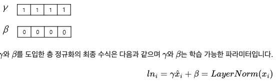 층 정규화는 크게 두 가지 과정으로 이루어지는데, 첫번째는 평균과 분산을 통한 정규화, 두번째는 감마와 베타를 도입하는 것이다. 우선 평균과 분산을 통해 벡터 x를 정규화 해준다. 여기서 평균과 분산값은 스칼라값이다.