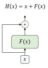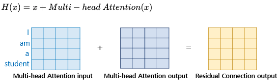 위 그림을 보면, 어떤 함수의 입력값과 함수의 결과를 더하고 있는 H(x) 함수가 있다. 여기서 어떤 함수 F(x)가 트랜스포머에서는 각 서브층을 뜻하게 되는데, 쉽게 말해 잔차 연결은 서브층의 입력과 출력을 더한것과 같다. 앞서 설명했듯이 트랜스포머에서 서브층의 입력과 출력은 동일한 차원을 가지고 있으므로, 서브층의 입력과 서브층의 출력은 행렬 덧셈 연산이 가능하다. 잔차 연결은 컴퓨터 비전 분야에서 주로 사용되는 모델의 학습을 돕는 기법이다.