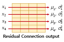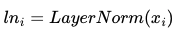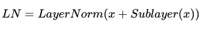 전차 연결을 거친 결과는 이어서 층 정규화 과정을 거치게 된다. 잔차 연결의 입력을 x, 잔차 연결과 층 정규화 두 가지 연산을 모두 수행한 후의 결과 행렬을 LN이라고 했을 때, 잔차 연결 후 층 정규화 연산을 수식으로 표현하면 다음과 같다.