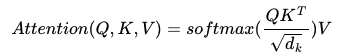 Q, K, V 벡터를 얻었다면 지금부터는 기존의 어텐션 메커니즘과 동일하다. 각 Q벡터는 모든 K벡터에 대해 어텐션 스코어를 구하고, 어텐션 분포를 구한 뒤에 이를 사용하여 모든 V벡터를 가중합하여 어텐션 값 또는 컨텍스트 벡터를 구한다. 이를 모든 Q벡터에 대해 반복한다. 스케일드 닷-프로덕트 어텐션은 이전 포스팅에서 다뤘던 어텐션 기법과는 다르게 어텐션 스코어를 구하기 위해 Q, V벡터의 내적만 하는 것이 아니라 아래와 같은 값을 스케일하는 수식이 하나더 들어간다.