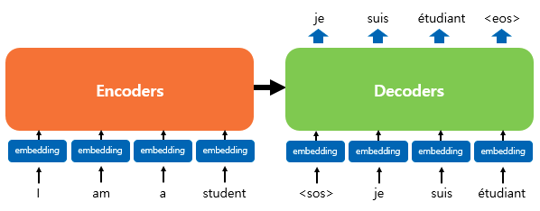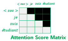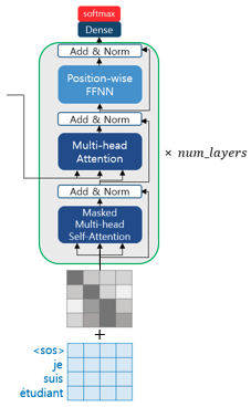 위 그림과 같이 디코더도 인코더와 동일하게 포지셔널 인코딩 단계를 거친 후 입력으로 들어간다. 트랜스포머 또한 RNN셀로 이루어진 seq2seq와 마찬가지로 교사 강요를 사용하여 훈련되므로 학습 과정에서 디코더는 번역할 문장에 해당 되는 <sos> je suis étudiant의 문장 행렬을 한 번에 입력받는다. 그리고 디코더는 이 문장 행렬로부터 각 시점의 단어를 예측하도록 훈련한다. 하지만 여기서 문제가 있는데, 기존 RNN으로 이루어진 seq2seq는 매 시점마다 순차적으로 입력받으므로 다음 단어 예측에 현재 시점을 포함한 이전 시점에 입력된 단어들만 참고할 수 있다. 반면, 트랜스포머는 문장 행렬을 한번에 입력받아서 현재 시점의 단어를 예측하고자 할 때, 입력 문장 행렬로부터 미래 시점의 단어까지도 참고할 수 있는 현상이 발생되는데, 이를 위해 트랜스포머의 디코더에서는 현재 시점의 예측에서 현재 시점보다 미래에 있는 단어들을 참고하지 못하도록 룩-어헤드 마스크를 도입했다.