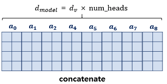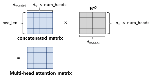 병렬 어텐션을 모두 수행하였다면, 모든 어텐션 헤드를 연결(concatenate)한다. 모두 연결된 어텐션 헤드 행렬의 크기는 (seq_len, dmodel)이 된다. 즉, 입력으로 들어온 행렬의 크기와 같게 된다.