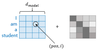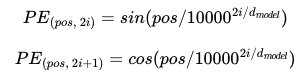 pos는 입력 문장에서의 임베딩 벡터의 위치를 나타내며, i는 임베딩 벡터 내의 차원의 인덱스를 의미한다. 위의 식에 따르면 임베딩 벡터 내의 각 차원의 인덱스가 짝수인 경우에는 사인함수, 홀수 인경우에는 코사인 함수를 이용한다. 위와 같이 포지셔널 인코딩 방법을 이용하면 순서정보가 보존되는데, 같은 단어라고 하더라도 문장 내의 위치가 다르면 트랜스포머의 입력으로 들어가는 임베딩 벡터의 값이 달라진다. 즉, 트랜스포머의 입력은 순서 정보가 고려된 임베딩 벡터가 된다.
