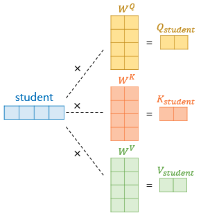 셀프 어텐션은 입력 문장의 단어 벡터들을 가지고 수행한다고 했지만, 사실 셀프 어텐션은 인코더의 초기 입력인 dmodel의 차원을 가지는 단어 벡터들을 사용하여 셀프 어텐션을 수행하는 것이 아니라 우선 각 단어 벡터들로부터 Q벡터, K벡터, V벡터를 얻는 작업을 거친다. 이때 Q벡터, K벡터, V벡터들은 초기 입력인 dmodel의 차원을 가지는 단어 벡터들보다 더 작은 차원을 가지는데 논문에서는 512의 차원을 가졌던 단어 벡터들을 64의 차원을 가지는 벡터로 변환하였다.