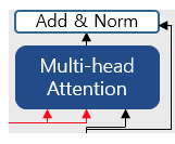 트랜스포머에서는 두 개의 서브층을 가진 인코더에 추가적으로 사용하는 Add & Norm이라는 기법이 있다. 그림을 보면 화살표가 서브층의 이전의 입력에서 시작되어 서브층의 출력부분을 향하고 있다.