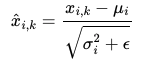여기서 입실론은 분모가 0이 되는 것을 방지하는 값이다. 마지막으로 감마와 베타를 도입한 최종 정규화 수식은 아래와 같다.(여기서 감마와 베타는 처음에 0과 1로 초기화 된다.)