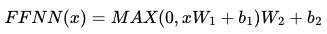 여기서 x는 멀티 헤드 어텐션의 결과로 나온 (seq_len, dmodel)의 크기를 가지는 행렬을 말한다. 가중치 행렬 W1은 (dmodel, dff)의 크기를 가지고, 가중치 행렬 W2는 (dff, dmodel)의 크기를 가진다. 논문에서는 은닉층의 크기인 dff는 2048의 크기를 가진다.