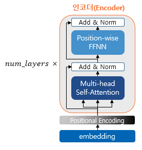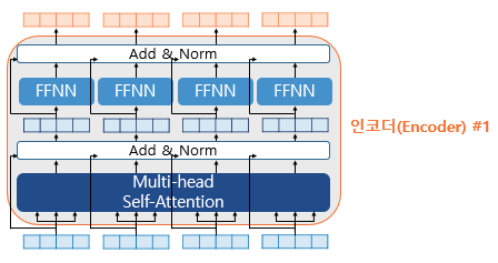 인코더를 하나의 층이라는 개념으로 보면, 하나의 인코더는 크게 총 2개의 셀프 어텐션과 피드 포워드 서브층으로 나뉜다.