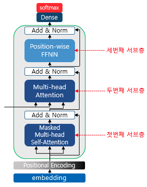 케라스에서는 층 정규화를 위해 LayerNormalization()을 제공한다. 지금까지 설명한 인코더 층에서의 출력은 디코더의 연산에 사용된다.