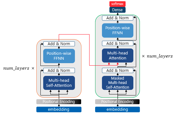 두 개의 화살표는 각각 Key와 Value를 의미한다. Query는 그림과 같이 디코더의 첫번째 서브층의 결과 행렬을 뜻한다.