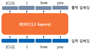 위 그림에서 [CLS] 토큰의 경우 초기 입력은 단순 임베딩 층을 지난 벡터에 지나지 않지만, 총 12개의 레이어를 지난 후 출력으로 나온 CLS의 벡터는 입력으로 들어간 모든 토큰을 참고한 문맥 정보를 가진 벡터가 된다. 이러한 연산은 CLS 토큰 이외의 모든 토큰도 마찬가지가 된다.