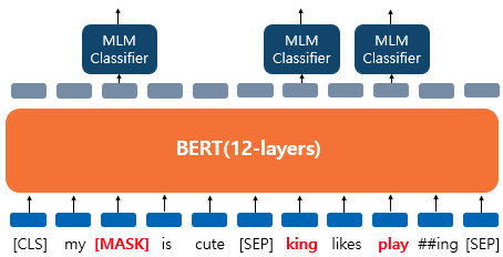 BERT는 사전 훈련을 위해서 입력으로 들어가는 입력 텍스트의 15%의 단어를 랜덤으로 마스킹한다. 그리고 인공 신경망에게 이 가려진 단어들을 예측하도록 한다. 더 정확하게는 15% 단어 전부를 마스킹 하지 않고 아래와 같은 규칙을 따른다.