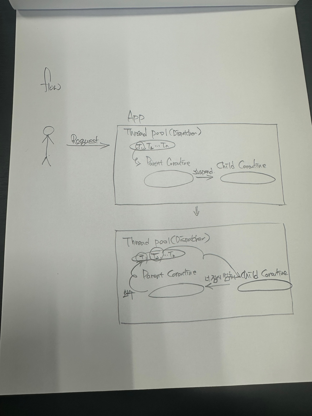 즉 코루틴 빌더(launch, async 등)을 이용해 suspend 함수를 사용하면 결국은 새로운 코루틴이 생기는 것인데, 그때 그 함수를 호출한 호출자는 잠시 실행을 멈춘다. (이 또한 다른 코루틴이고 다른 스레드에서 실행되고 있을 테니까) 실행을 멈추게 되면 사용하고 있던 스레드는 반납되고 호출된 새로운 코루틴이 작업을 시작한다.