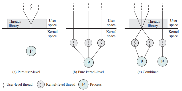 위 그림과 같이 우선 Thread에는 유저 레벨 쓰레드, 커널 레벨 쓰레드, 혼합형 쓰레드가 있다.