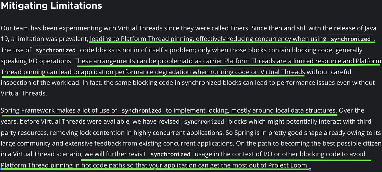 synchronized가 많이 남아있는 Spring Boot 2.x에서는 Virtual Thread를 잘 사용하기 위해서는 여러 의존 모듈의 마이그레이션이 선행되어야 할 것 같다. 앞으로 미래 Java 버전에서는 synchronized는 점점 사라질 것으로 예상한다.