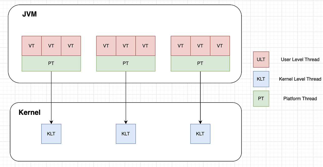 Virtual Thread는 기존 KLT(1) : ULT(1)의 구조가 아닌 KLT(1) : ULT(1) : Virtual Thread(N)의 구조로 사용된다. KLT와 Virtual Thread 사이의 ULT는 플랫폼 스레드라고 한다.