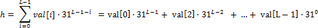예제 11은 Horner's method를 구현한 것이다. Horner's method는 다항식을 계산하기 쉽도록 단항식으로 이루어진 식으로 표현하는 것이다. 즉 예제 11에서 계산하고자 하는 해시 값 h는 다음과 같다.