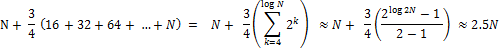 임계점에 이르면 항상 해시 버킷 크기를 두 배로 확장하기 때문에, N개의 데이터를 삽입했을 때의 키-값 쌍 접근 횟수는 다음과 같이 분석할 수 있다.