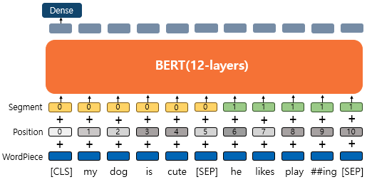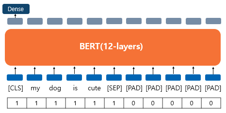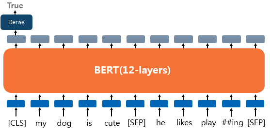 입력이 하나의 문장이고, 해당 텍스트에 대한 분류를 할때는 앞서 설명한 것과 같이 CLS 토큰의 출력을 이용한다. 즉, 파인 튜닝 단계에서 텍스트 분류 문제를 풀기 위해서 CLS 토큰 출력 위치에 Dense Layer(fully-connected layer) 층을 추가하여 분류에 대한 예측을 하게 된다.