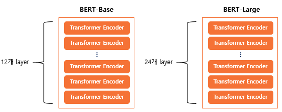 버트는 트랜스포머의 인코더-디코더의 구조를 따라가는 것은 아니고, 인코더만 여러 레이어로 쌓아 올린 구조이다. Base 버전에서는 총 12개, Large 버전에서는 총 24개의 인코더 레이어를 쌓았다. 그리고 각 버전은 모델의 차원수도 차이가 있고, 셀프어텐션 헤드수도 다르기때문에 아래와 같은 파라미터 개수를 갖는다.
