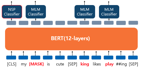 BERT의 입력으로 넣을 때에는 [SEP]라는 특별 토큰을 사용해 두 문장을 구분한다. 그리고 위 그림에서 보듯이 문장이 이어지는지 아닌지 등의 분류 문제에는 CLS 토큰의 출력을 이용한다. 또한 마스크드 언어 모델 학습과 다음 문장 예측은 서로 별도로 학습하는 것이 아니라, 각 문제의 loss를 합하여 학습이 동시에 이루어진다.