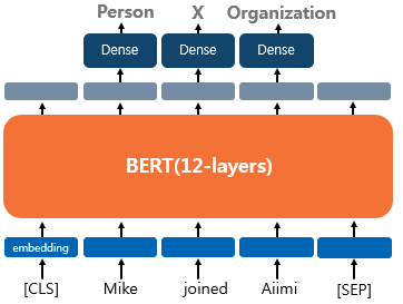 하나의 텍스트에 대해 엔티티 혹은 품사를 태깅하는 작업에 대해 파인 튜닝 할때는 스페셜 토큰을 제외한 실제 입력 토큰의 출력층에 Dense Layer를 사용하여 분류에 대한 예측을 하게 된다.