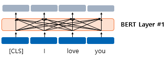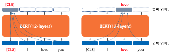 위 그림에서 [CLS] 토큰의 경우 초기 입력은 단순 임베딩 층을 지난 벡터에 지나지 않지만, 총 12개의 레이어를 지난 후 출력으로 나온 CLS의 벡터는 입력으로 들어간 모든 토큰을 참고한 문맥 정보를 가진 벡터가 된다. 이러한 연산은 CLS 토큰 이외의 모든 토큰도 마찬가지가 된다.