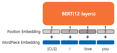 위 그림에서 보이듯 워드피스 임베딩을 통해 나온 벡터에 포지션 임베딩을 더해주는 행위를 하여 임베딩에 위치정보를 반영한다. 여기서 포지션 임베딩은 위치 정보를 위한 임베딩 레이어를 하나 더 사용하고, 만약 문장의 길이가 4라면 4개의 포지션 임베딩 벡터를 학습시킨다.